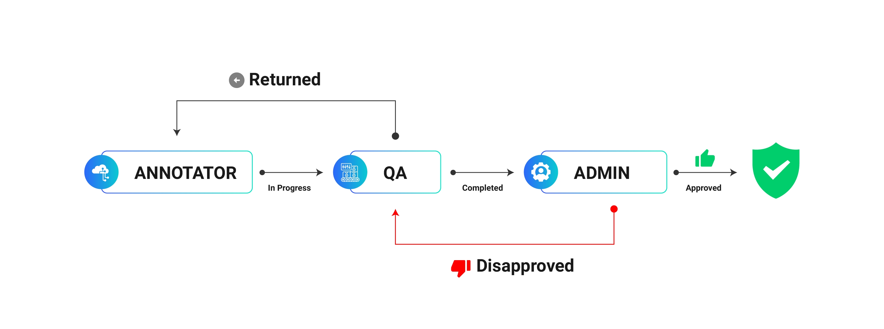 An annotator leads the task of labeling content like images or video that makes it recognizable for machine learning models and use the same for further predictions. The annotator’s work is verified by the QA team. The QA team has the authority to return the labeling back to the annotator for redoing it, if they feel there is a compromise in the quality. Once the QA approves it, it is passed on to the Admin. The admin, once again, has the authority to disapprove and send it back to QA team. The QA redoes the work or finds another annotator. Data security and privacy are the major assets to be considered while approving. Once the Admin approves, the process is completed.