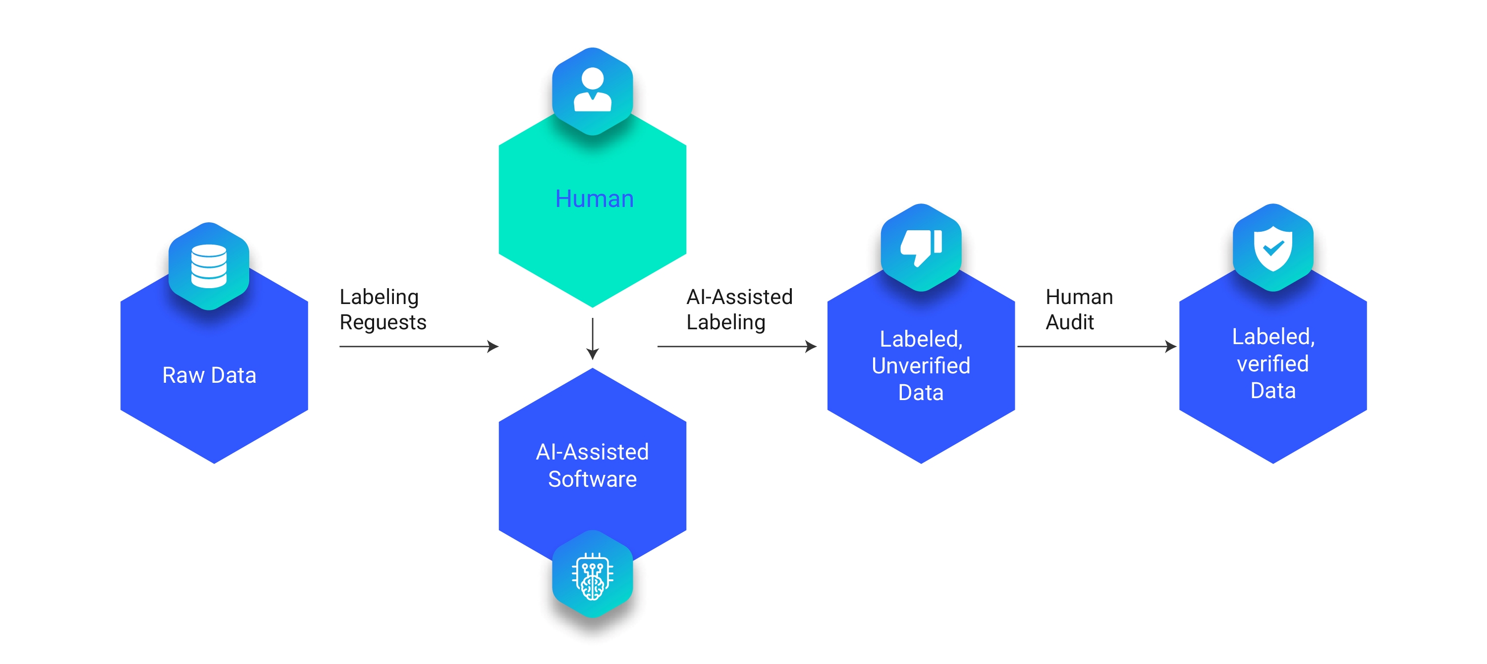 Raw data is requested for labeling by the annotation tool. The annotation tool is a combination of human intelligence and AI-assisted software. The result of this tool is passed further for AI-assisted labeling. The labeled, unverified data is discarded at this stage and the verified ones are further goes through a human auditing, the result of which is labeled, verified data.